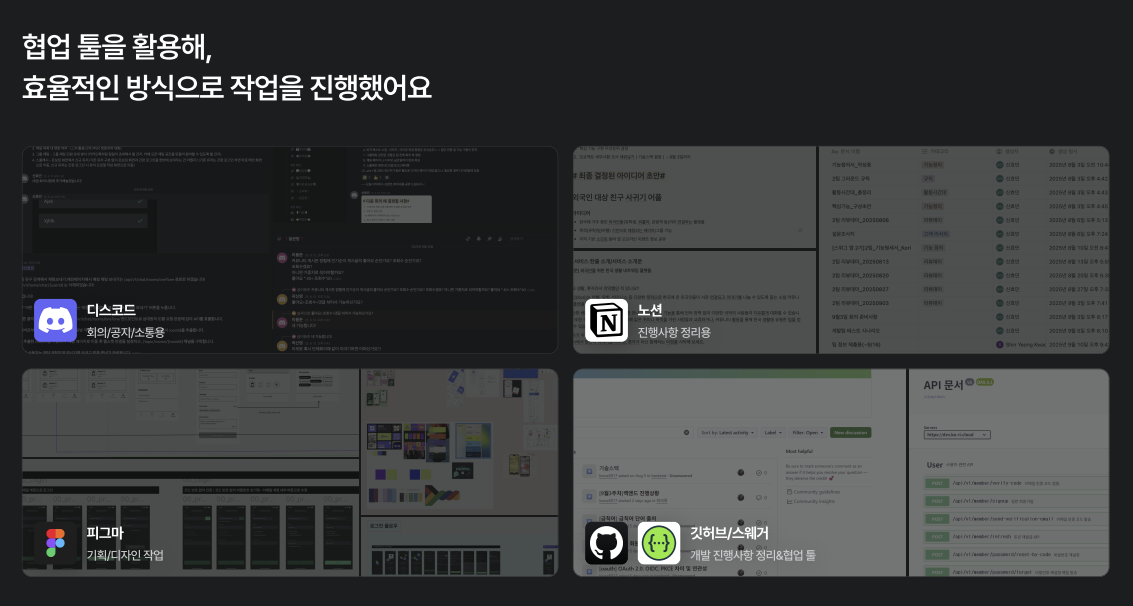 또한 GitHub Discussion을 통해 개발팀 내의 이슈를 논의하고 기술 문서를 정리했으며, Swagger로 API 명세서를 관리하여 백엔드와 프론트엔드 간의 원활한 연동을 도왔습니다.