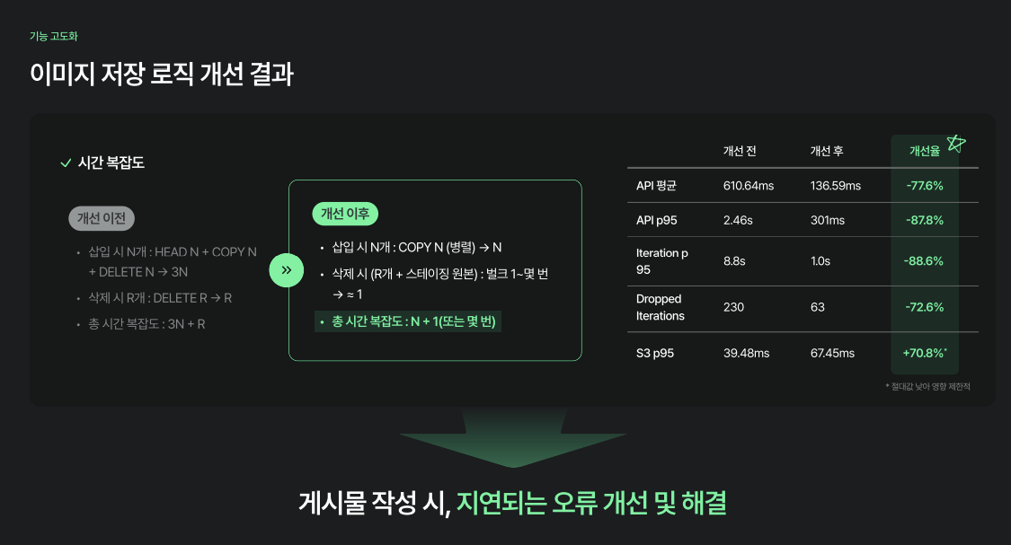 그 결과, 전체 시간 복잡도가 기존 3N+R에서 N+1로 단순화되었으며, API 평균 응답 속도가 약 77.6% 향상되었습니다. 이후 사용자들의 체감 속도가 눈에 띄게 개선되었고, 트래픽 피크 상황에서도 안정적인 서비스 운영이 가능해졌습니다.