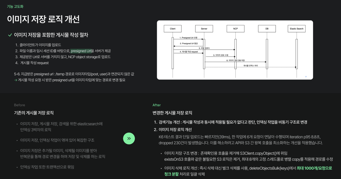 이에 팀은 검색 결과의 실시간 반영이 필수적이지 않다는 점을 확인하고, 인덱싱 로직을 비동기 처리로 전환했습니다. 또한 NCP 업로드 과정의 중복 검증을 제거하고, 이미지 경로 수정은 고정 8개 스레드 풀을 활용한 병렬 처리 방식으로 개선했습니다. 이미지 삭제는 최대 1,000개 단위로 배치 처리하여 효율성을 높였습니다.