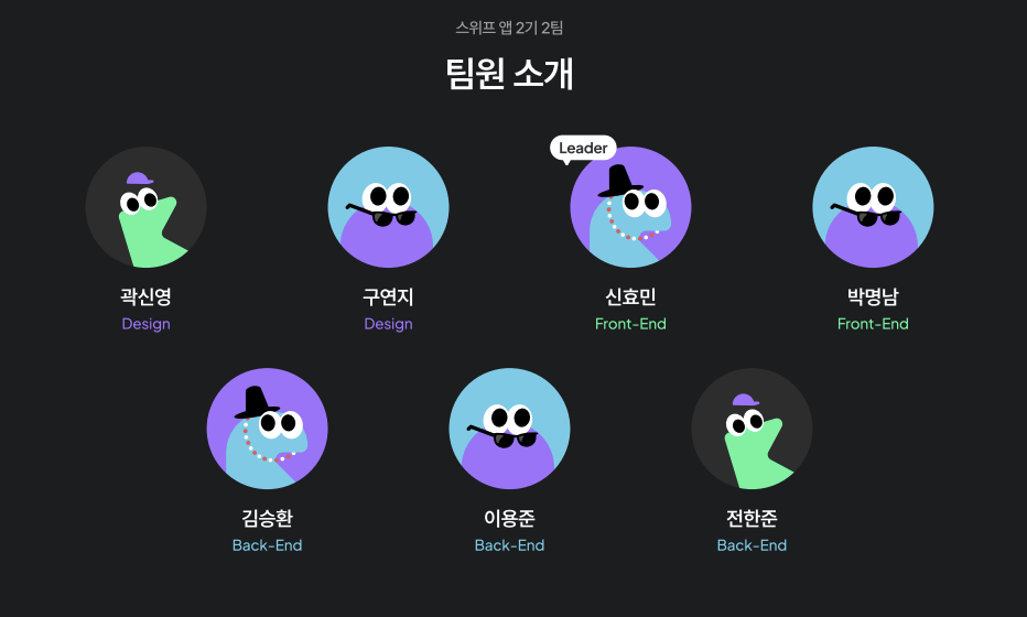 디자이너 2명, 앱 개발자 2명, 백엔드 개발자 3명, 총 7명으로 이루어진 팀으로, 짧은 기간 동안 즐겁게 협업하며 하나의 서비스를 완성했습니다.